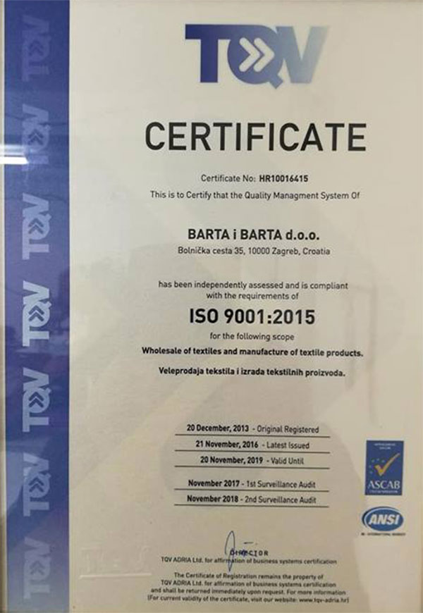 Međunarodna organizacija International Certification Registrar Ltd. izdao nam je Certifikat koji dokazuje da je Sustav upravljanja kvalitetom sukladan zahtjevima međunarodnog standarda ISO 9001:2008. Certifikat pokriva opseg veleprodaje tekstila i izrade tekstilnih proizvoda. U toj domeni imamo educiran i vrlo kvalitetan kadar koji svojim znanjem i stečenim iskustvom može udovoljiti svakom zahtjevu na najvišem nivou kvalitete.
